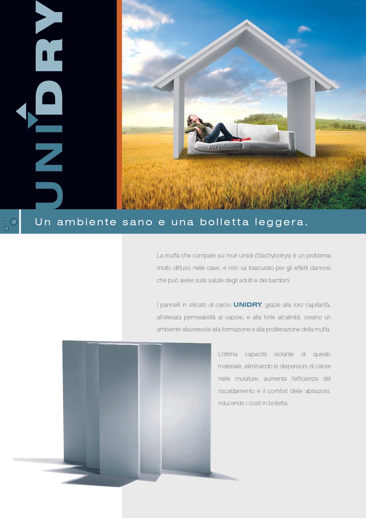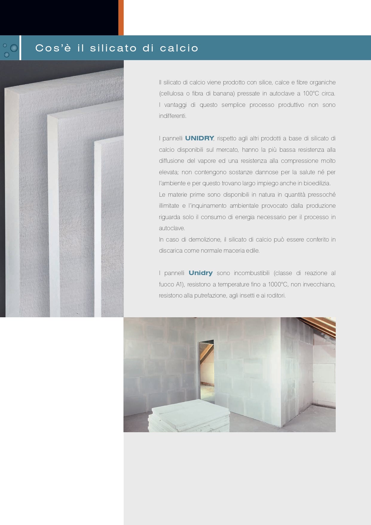 I pannelli UNIDRY, rispetto agli altri prodotti a base di silicato di calcio disponibili sul mercato, hanno la più bassa resistenza alla diffusione del vapore ed una resistenza alla compressione molto elevata; non contengono sostanze dannose per la salute né per
